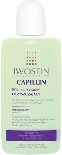 Płyn micelarny oczyszczający Iwostin Capillin skutecznie oczyszcza i pielęgnuje wrażliwą skórę naczynkową. Zawarty w preparacie Pronalen Aesculus HSC wraz z trokserutyną zwiększa elastyczność i napięcie naczyń włosowatych. Dzięki zastosowania unikalnych pod względem bezpieczeństwa stosowania substancji oczyszczających preparat usuwa zanieczyszczenia oraz zmywa makijaż bez użycia wody.