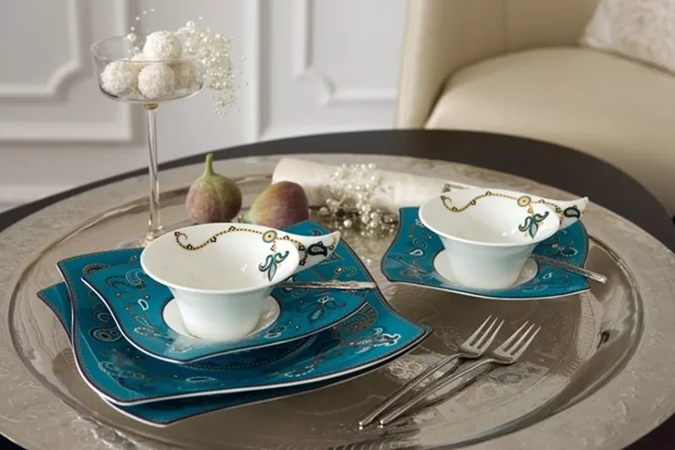 Mając przed oczami przytulne saloniki w hotelowych barach gdzie delikatna muzyka i wygodne fotele zachęcają do relaksu, projektanci z Villeroy&Boch stworzyli dwie podkolekcje "Samarah". Dzięki nim także w domu możemy stworzyć tę niepowtarzalną atmosferę odprężenia i relaksu. "Samarah Turkus" przedstawia odmianę wzoru w wersji turkusowej. Ten kolor przywołuje dwa skojarzenia. Przede wszystkim jest to kolor Braminów, hinduskich przywódców religijnych i ludzi z wyższej kasty. Według europejskiej teorii barw z kolei, to kolor chłodny i odświeżający. Został on wybrany do stworzenia kolekcji wysmakowanych przedmiotów do podawania herbaty. Centralnym elementem jest tu zgrabna etażerka na ciastka.