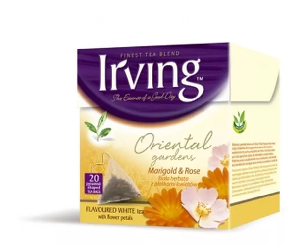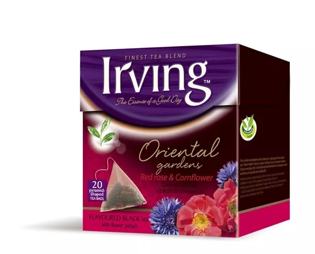 Linia Oriental Gardens IRVING to trzy oryginalne herbaty: Czarna z płatkami róży i bławatka, Zielona z płatkami jaśminu i kwiatu pomarańczy, Biała z płatkami róży i nagietka. Ale wyjątkowości tej linii tkwi nie tylko w smaku herbat, lecz również w formie ich opakowania. Duża, jedwabista saszetka-piramidka umożliwia pełne rozwinięcie liści herbaty, a co za tym idzie – idealne zaparzenie, głęboki smaki i intensywny aromat.