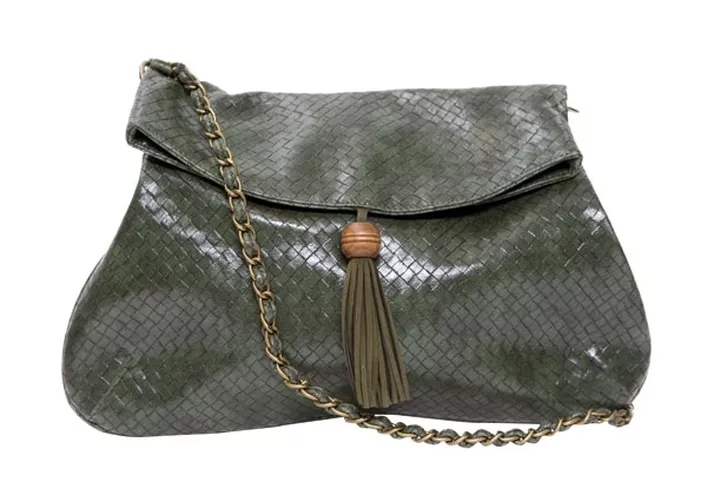 Piękna torebka z błyszczącej skóry ozdobiona łańcuszkiem, bo każda kolejna torebka zawsze się przyda.
