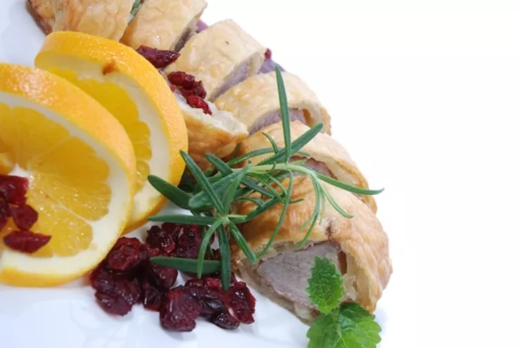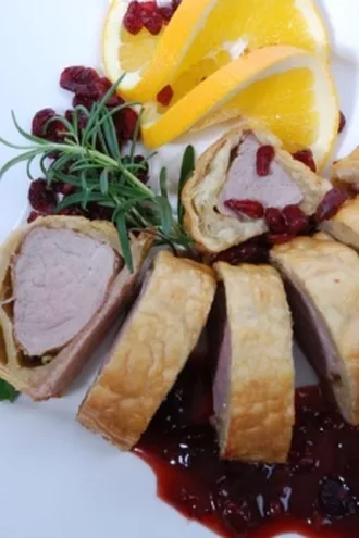 Polędwiczka wieprzowa pieczona w cieście podana w sosie z borówek