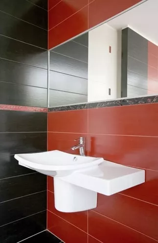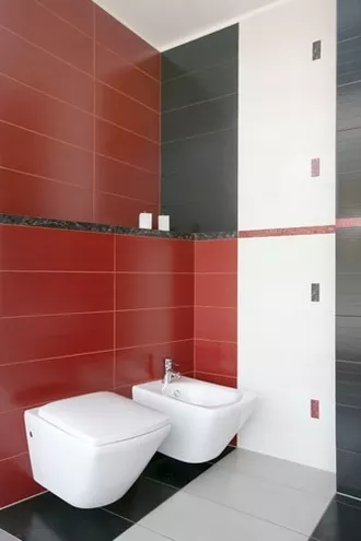 Łazienka utrzymana w klimatach orientalnych to albo feeria barw, przepych i kunszt wzorniczy, albo oszczędne minimalistyczne wnętrze, w którym występują tylko niezbędne funkcjonalnie elementy. Wybieramy dla Państwa wariant drugi. W aranżacjach zastosowano wspomniane kontrasty kolorystyczne – na dużych płaszczyznach ścian sąsiadują ze sobą czerwień i czerń oddzielona śmiałymi akcentami bieli w postaci pionowego ornamentu i chłodnej bieli nowoczesnej ceramiki.