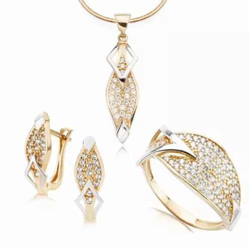 – komplet: pierścionek, kolczyki, zawieszka (żółte i białe złoto próby 0,585; cyrkonie)