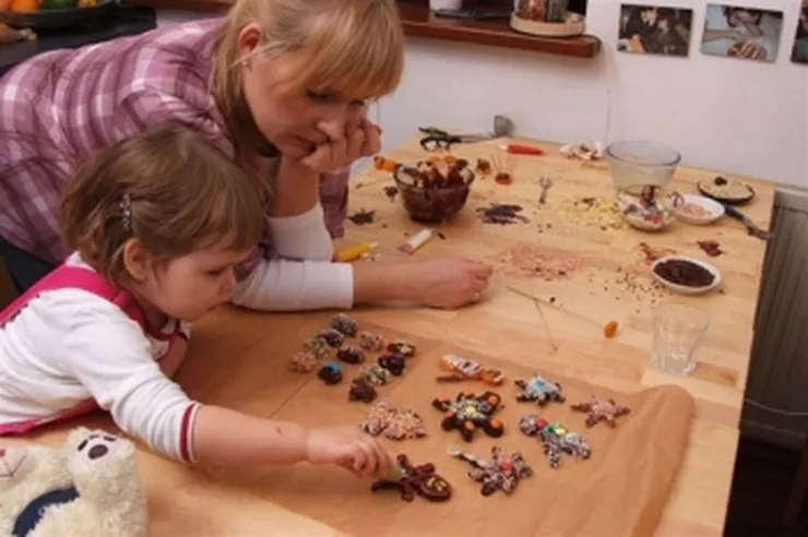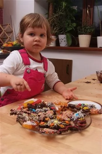 Prosimy dziecko, by w suszone owoce wbiło wykałaczki lub patyczki do grilla, następnie tłumaczymy, jak można uformować przeróżne postacie lub kształty. Gwiazdki, bałwanki, choinki będą oryginalną ozdobą świątecznego stołu. Tworzenie z owoców i wykałaczek przypomina trochę robienie figurek z kasztanów i żołędzi, a to przecież gwarancja świetnej zabawy. By zmęczone paluszki naszego dziecka mogły odpocząć, zachęcamy je do robienia małych kuleczek z marcepanu, które następnie staramy się włożyć do daktyli w miejsce po pestce. Gdy dziecko zajęte jest twórczym lepieniem, my w tym czasie rozpuszczamy czekolady. W dwóch garnuszkach podgrzewamy mleko, a gdy jest już ciepłe wrzucamy czekolady, cały czas mieszając. Musimy pamiętać, by rozpuszczać czekolady na wolnym ogniu, by się nie przypaliły. Gdy są już gotowe, przelewamy całość do miseczek i czekamy aż lekko przestygnie. Następnie pokazujemy dziecku, jak zamaczać w czekoladowych masach stworzone wcześniej figurki i marcepanowe przysmaki. Każde z nich po wyjęciu z czekolady, nadaje się do udekorowania. A tu już pole do popisu możemy w pełni zostawić naszym pociechom - guziczki dla bałwanków, bombki na choinkach i co tylko fantazja naszym maluchom podpowie… Efekt naszej pracy wkładamy do lodówki, by czekolada stwardniała. Radzę robić na kilka godzin przed podaniem, bo tym pysznościom trudno się oprzeć! Zabawa jest pyszna – dosłownie i w przenośni.