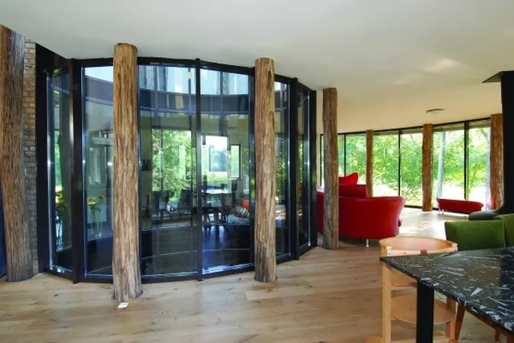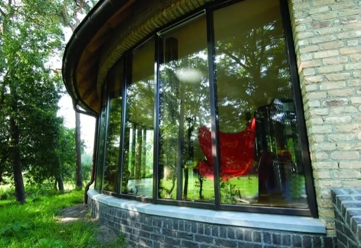 Fasadę szybu świetlnego, podobnie jak wielkie okna domu, wykonano z zastosowaniem systemu fasadowego CW 50 firmy Reynaers. Zalety użytkowania aluminium: niewielkie wymagania konserwacyjne, trwałość oraz fakt, że można je łatwo poddać recyklingowi, zdecydowały o wyborze tego rozwiązania. Aluminium doskonale integruje się z organiczną architekturą Huuba van Laarhovena, a mieszkańcom gwarantuje najwyższą jakość użytkowania.