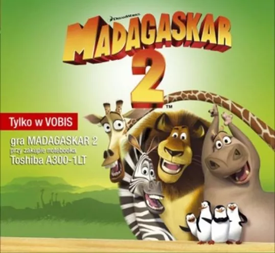 Film animowany Madagaskar 2, opowiadający o grupce przyjaciół z nowojorskiego ZOO, którzy postanowili zasmakować wolności, toczy się tym razem na rozległych afrykańskich sawannach. Zmagając się z własnymi wielkomiejskimi przyzwyczajeniami i swoimi dzikimi kuzynami szukają powrotu do domu w Nowym Jorku. Dla wszystkich dzieci, ale także i dorosłych, którym nowe przygody zwierzaków przypadły do gustu, Vobis przygotował szereg niespodzianek. Jedną z nich jest prezent dołączany do notebooka Toshiba A 300 –1 LT - gra komputerowa Madagaskar 2.