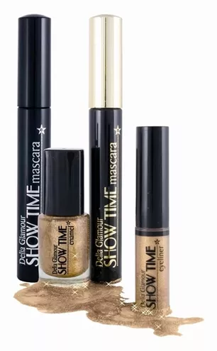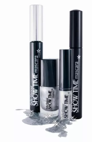 Mascara Delia Glamour Show Time, to propozycje dwóch brokatowych tuszy, w kolorach złotym i srebrnym, zawierających mieniące się drobiny, pozostające na rzęsach na długo po ich aplikacji. Kosmetyki możemy nałożyć bezpośrednio na rzęsy lub na ich końcówki po uprzednim wytuszowaniu np. mascarą Delia Glamour.