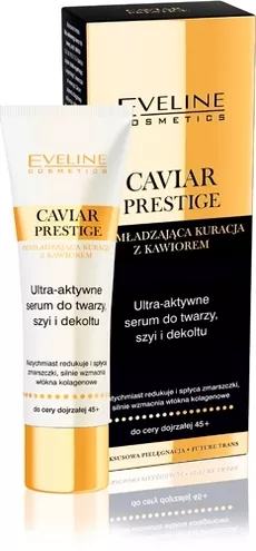 Zawarty we wszystkich produktach serii czarny kawior to ekskluzywny składnik, który regeneruje skórę na poziomie komórkowym. Jest również najbogatszym źródłem protein, minerałów, fosfolipidów, a także oligoelementów: jodu, fosforu, cynku, magnezu, witamin A, D, E oraz witamin z grupy B. Działa niezwykle wygładzając i nawilżająco, zwiększa gęstość i elastyczność skóry, skutecznie redukuje nawet głębokie zmarszczki. Dzięki zawartości nienasyconych kwasów tłuszczowych Omega-3 odbudowuje hydrolipidową warstwę naskórka oraz wzmacnia właściwości ochronne skóry. W linii CAVIAR PRESTIGE działanie kawioru zostało wzmocnione zastosowaniem Future Trans – kompleksu z aktywnymi mikrocząstkami, które przenikają w najgłębsze warstwy naskórka, przygotowując skórę do intensywnej terapii odmładzającej aktywnymi komponentami zawartymi w serii.