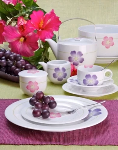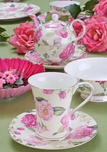 Miłośnikom kwiatowych wzorów z pewnością przypadnie do gustu kolekcja galanterii stołowej Emily. Wykonana z najwyższej jakości porcelany typu bone china o delikatnym kremowym kolorze ozdobiona jest pięknym różanym wzorem w żywym, jasno fioletowym odcieniu. Brzegi naczyń wykończone są delikatną złotą linią, co nadaje całej kolekcji wyjątkowej elegancji. W skład kolekcji wchodzą pakowane w ozdobne pudełka zestawy - filiżanka ze spodkiem i talerzykiem deserowym, filiżanka ze spodkiem i czajniczkiem, kubek ze spodkiem i podstawką na torebkę herbaty oraz talerz do ciasta z łopatką, salaterka na słodycze, czajnik z cukiernicą i mlecznikiem. Kolekcja ta umili picie herbaty i serwowanie deserów, jak również może stać się źródłem inspiracji na eleganckie i praktyczne upominki.