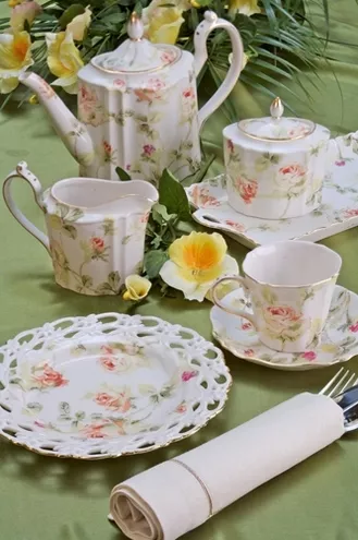 Wiosenną, aromatyczną herbatę w angielskim stylu możesz podać w zastawie z nowej kolekcji Vera marki Villa Italia. Zastawa ta wykonana jest z porcelany o ciepłym, mlecznym odcieniu bieli. Jej urok tkwi w pięknym kwiatowym wzorze w subtelne róże. Elementem wyróżniającym tę kolekcję jest misterne, ażurowe wykończenie brzegów talerzyków deserowych oraz ręcznie nakładana cienka linia złota zdobiąca brzegi wszystkich naczyń. Na zestaw składa się sześć filiżanek ze spodkiem i talerzy deserowych, czajnik, cukiernica, mlecznik oraz prostokątna tacka.