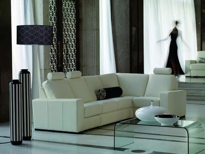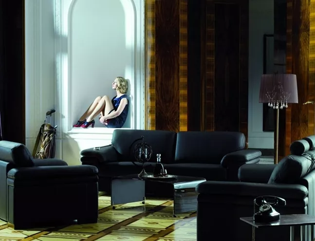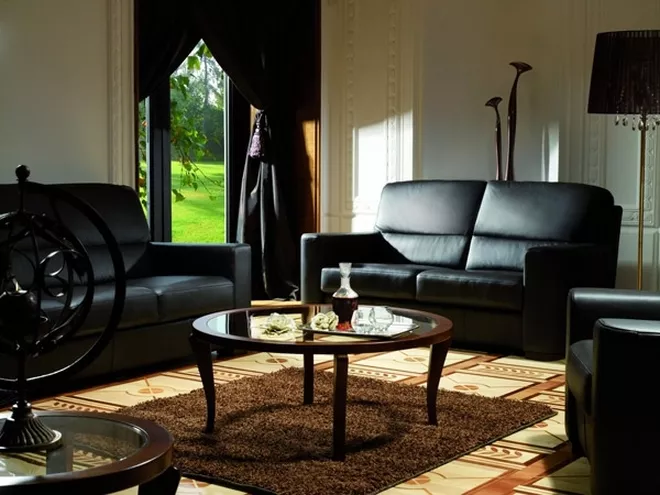 Zwarty ale jednocześnie obszerny i wyjątkowo komfortowy model do dużych salonów. Aby zburzyć jednostajność bryła mebla złożona została z mniejszych elementów i „przecięta” ozdobnymi szwami.