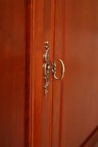 Wybrane bryły kredensów oraz witryn z linii Rafael kryją w sobie dodatkową tajemnicę. Delikatna, metalowa aplikacja umiejscowiona na wysokości szuflad to zarówno ozdobny element bryły, jak i mechanizm otwierający ukryty schowek.