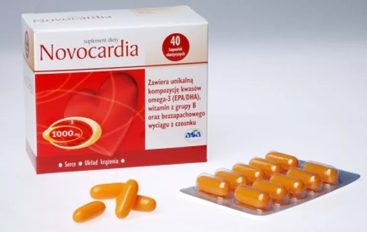 Wieloskładnikowy suplement diety jakim jest Novocardia, wytwarzana przez firmę ASA, posiada tak skomponowaną recepturę, by jak najefektywniej wpływać na zdrowie i dobrą kondycję układu krążenia. Preparat zawiera wysokogatunkowy olej rybi z kwasami omega 3 : EPA i DHA w specjalnie dobranych proporcjach, kwas foliowy, witaminy B6 i B12, wyciąg z czosnku (reguluje poziom cholesterolu i ciśnienie krwi, uelastycznia ściany naczyń krwionośnych) i jako przeciwutleniacz - witaminę E.