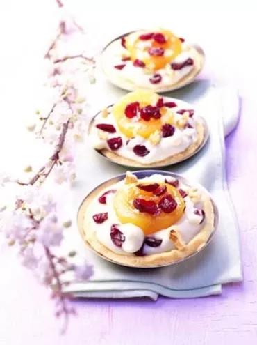 3. Morele odsączyć z zalewy i wyłożyć na krem wierzchem na dół. Wymieszać dżem z pozostałą częścią cranberries i posmarować nim morele. Posiekać orzechy, posypać nimi tarty.