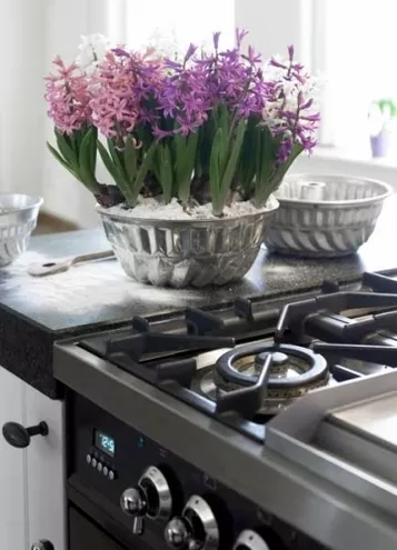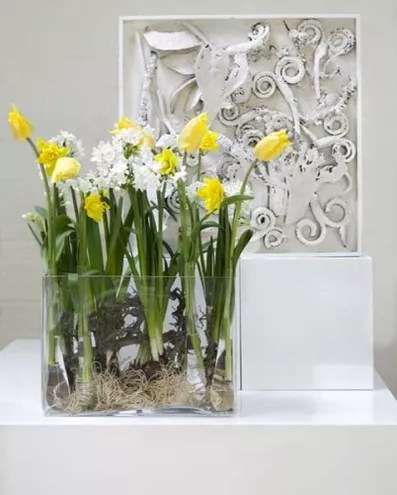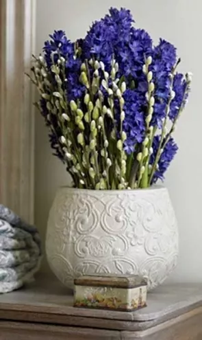 Jako dodatki proponowane są skorupki od jajek, bazie, białe pióra, kolorowe patyczki czy drewniane pisanki, czyli przedmioty powszechnie kojarzone z Wielkanocą. Do doniczkowych hiacyntów doskonale sprawdzi się także foremka po babce. Dominującymi kolorami kwiatów są żółty i biały, ale warto użyć w kompozycjach także bardziej zdecydowanych kolorów, np. pomarańczowego, różowego czy fioletowego.