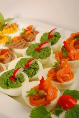 Jaja ugotować na twardo, obrać, przekroić na połowę, wyjąć żółtka. Żółtka i kilka całych połówek podzielić na pięć równych część. Do poszczególnych części dodać oddzielnie podsmażone pieczarki, szpinak, łosoś wędzony, chrzan, paprykę. Wszystkie części oddzielnie zmiksować, dodać pieprz kolorowy, szczypiorek, natkę pietruszki, doprawić solą. Tak przygotowanym farszem wypełnić puste połówki jaj. Jajka są gotowe do podania.