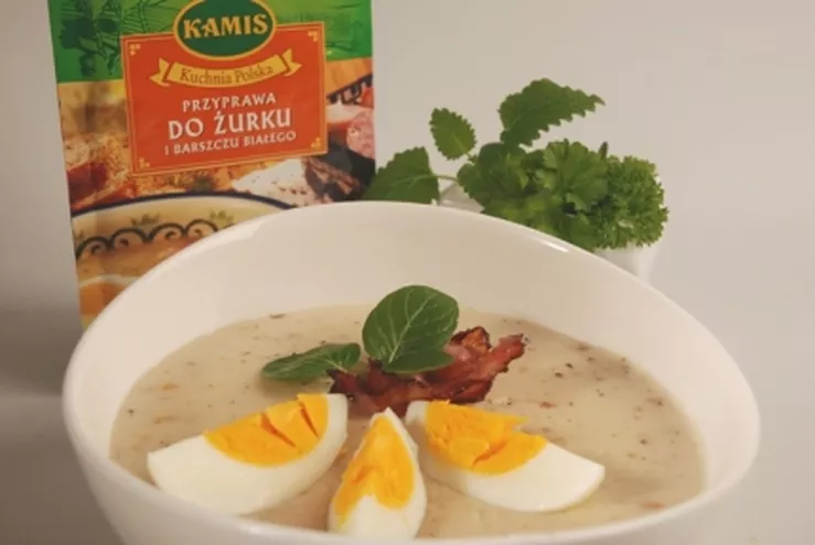 Namoczyć grzyby, a następnie pokroić w paski. Żeberka, boczek, szponder zalać wodą, dodać włoszczyznę, pokrojone grzyby, doprawić liściem laurowym i zielem angielskie. Gotować ok. 2 godz. na małym ogniu. Mięso wyjąć, obrać z kości, pokroić w paski, podsmażyć, przełożyć ponownie do wywaru. Dodać pokrojoną w kostkę, podsmażoną cebulę. Wlać tyle zakwasu, aby żurek był dobrze kwaśny, dodać przyprawę do żurku i barszczu białego, w razie potrzeby doprawić solą. Podawać ze śmietaną, jajkiem i białą kiełbasą.