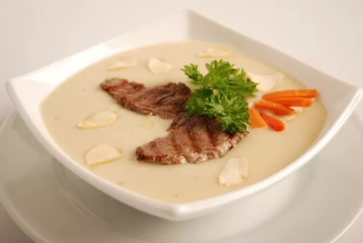 Szponder wołowy zalać wodą, dodać włoszczyznę, cebulę, korzeń chrzanu, liść laurowy, ziele angielskie, czosnek. Gotować na małym ogniu około 90 min. Następnie dodać pokrojone w kostkę ziemniaki. Pod koniec gotowania dodać śmietanę, tarty chrzan, doprawić do smaku. Podawać z kawałkami wołowiny.