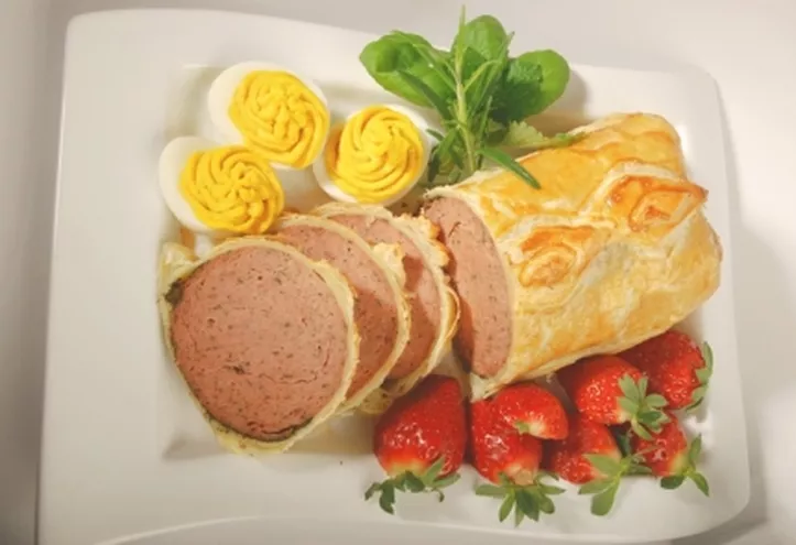 Mięso podsmażyć z cebulą, dodać ziele angielskie, liść laurowy, Podlać wodą i dusić około 90 min. Następnie mięso zmielić trzykrotnie przez maszynkę, dodając bułkę namoczoną w mleku. Dodać jaja, doprawić do smaku, wyrobić na jednolitą masę, Piec w podłużnej foremce około 50 min w temp. 180 stopni. Wystudzić, wyjąć z foremki, owinąć ciastem francuskim, posmarować rozkłóconym jajkiem, piec ponownie 15 min w temp. 180 stopni.