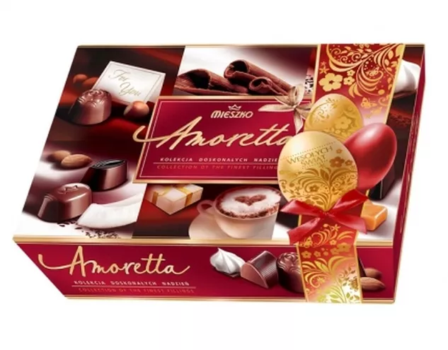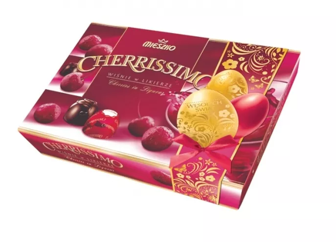 W kategorii bombonier, Mieszko proponuje dwie linie graficzne - pierwszą z nich jest linia tradycyjna, utrzymana w radosnych wiosennych kolorach. W ramach tej grupy, dostępna jest bomboniera Twój Sekret oraz Wiśnie w likierze. Druga z przygotowanych linii, to seria elegancka, również nawiązująca do motywów wielkanocnych, ale bardziej stonowana. W tej stylistyce Mieszko oferuje ozdobioną okazjonalnymi ornamentami bombonierkę Amoretta, Chocoladorro, oraz bombonierki z linii La Stella. W serii produktów eleganckich znalazły się także zawierające wiśnie w czekoladzie bombonierki Cherrissimo w czterech wariantach opakowań.