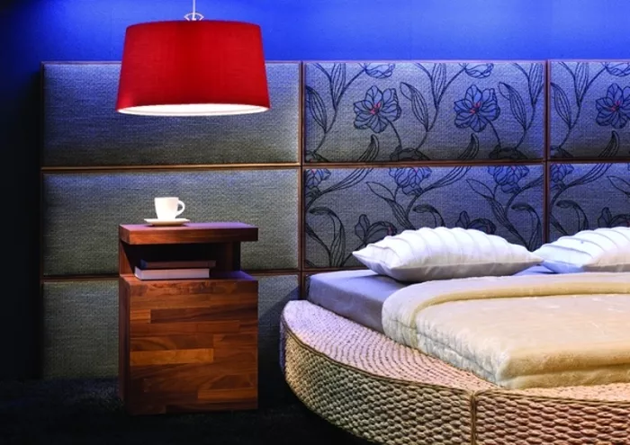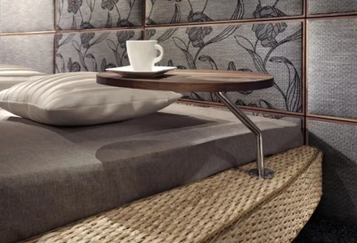 Wygodę Nuovo podkreśla także duże tapicerowane wezgłowie, podzielone na kilka regularnych modułów. W aranżacji na załączonych zdjęciach widzimy na nim tkaninę Deauville firmy Italvelluti. Wyróżniają ją stonowane, spokojne barwy, wyrafinowany, tweedowy splot i regularnie powtarzający się, duży, kwiatowy wzór. Jak wszystkie tkaniny z kolekcji „Echi Deco” nawiązuje ona do elegancji i zgeometryzowanych motywów dekoracyjnych stylu art deco. Znakomicie podkreśla ekskluzywny charakter mebli wykonanych z ciemnego drewna orzecha i buduje nastrojowy klimat sprzyjający wypoczynkowi.