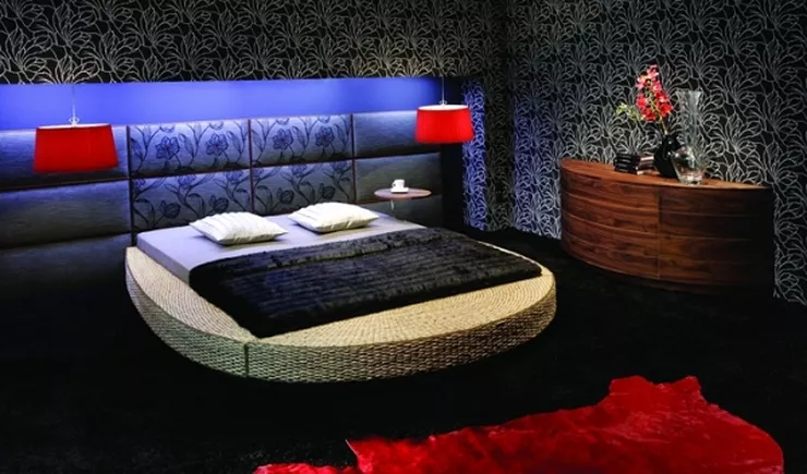 Imponujące rozmiary Nuovo (220x259 cm) gwarantują komfort wypoczynku. Bardzo praktycznym rozwiązaniem jest obrotowy stolik na metalowym ramieniu – można na nim zjeść śniadanie w łóżku, popracować na laptopie lub odłożyć książkę. Obok łóżka mogą stanąć także tradycyjne szafki nocne. Okrągły kształt łóżka uzupełnia ciekawie komoda z łukowato wygiętym frontem.