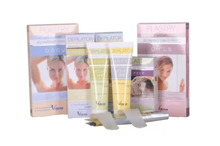 W skład linii kosmetyków Velvet Skin wchodzą depilujące kremy, żele i plastry z woskiem, wzbogacone dodatkami składników ochronno – pielęgnujących.