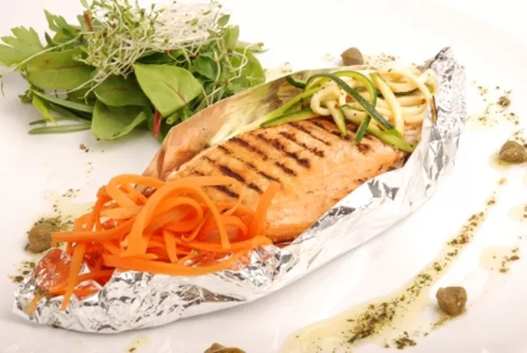 Łosoś w papilotach z warzywnym spaghetti