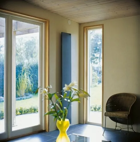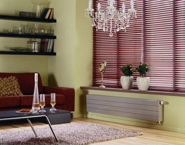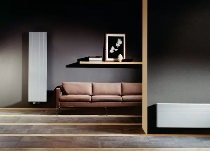 Paradoksalnie jednak także bardzo niski grzejnik może podkreślić przestrzenny i przejrzysty charakter pomieszczenia, o ile znajdziemy nań odrobinę miejsca pod dużym oknem. Purmo Faro H (wersja pozioma) ma poziome przetłoczenia na płycie czołowej i w odpowiednio dobranym kolorze znakomicie zaakcentuje otwarty charakter naszego lokum (oraz jego właściciela). Jego pionowy wariant (Purmo Faro V) w jasnym kolorze dobrze wpasuje się w tło naszego pokoju wypoczynkowego o nieco ciemniejszych ścianach, ale jaśniejszych meblach.
