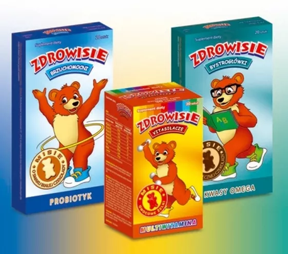 Zdrowisie Brzuchomocni to preparat występujący w postaci misiów o smaku białej czekolady - unikalne połączenie probiotyku oraz prebiotyku. Zastosowanie dobroczynnego probiotyku wspomaga przywracanie równowagi bakteryjnej po kuracji antybiotykowej. Brzuchomocni wpływają pozytywnie na system odpornościowy organizmu dzieci i wspomagają przebieg leczenia chorób infekcyjnych. Zdrowisie Bystrogłówki to nowoczesny preparat w postaci misiów o smaku mlecznej czekolady, którym można zastąpić przykry obowiązek przyjmowania tranu. Zawierają kompleks kwasów omega-3, 6, 9 oraz witaminę E. Dzięki nim możliwy jest prawidłowy rozwój dziecka, szczególnie funkcjonowanie mózgu i układu nerwowego. W okresie wzmożonego wysiłku intelektualnego i zawsze wtedy gdy młody człowiek ma przewlekłe trudności z koncentracją można zastosować wspomagająco Bystrogłówki.