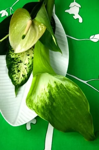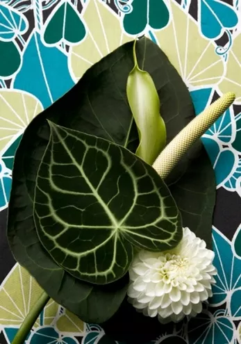 Piękno tkwi w prostocie. Niezliczone faktury i kształty są dowodem na różnorodność jaka występuje w przyrodzie. Zielone liście anturium i biała dalia uspakajają nas i wyciszają przed zgiełkiem dużych miast. Anturium i jego liście, Dalia