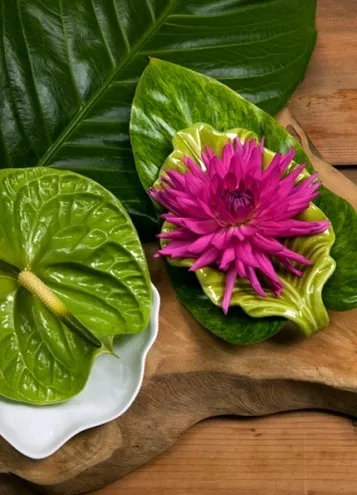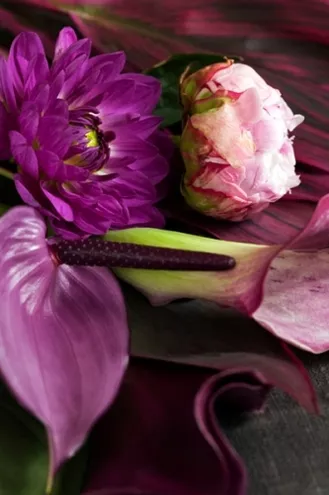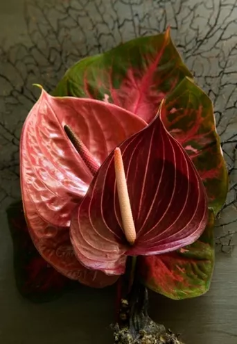 Czasami minimalizm może wywołać w nas wiele pozytywnych emocji. Anturium w dwóch odcieniach różu na tle liścia kaladium to delikatny i elegancki akcent na każdym stole. Anturium, liście Kaladium