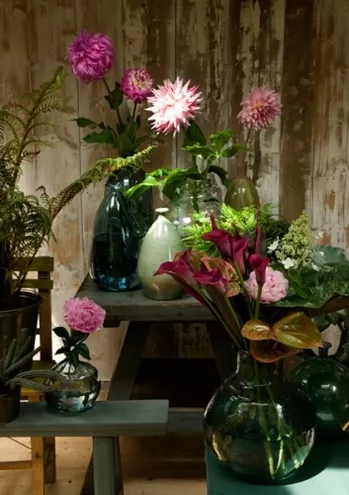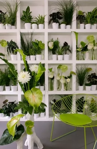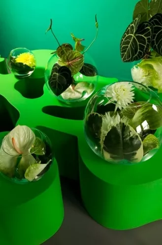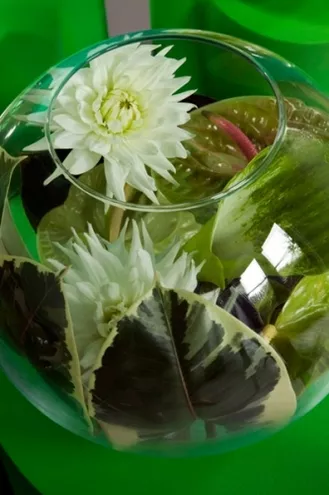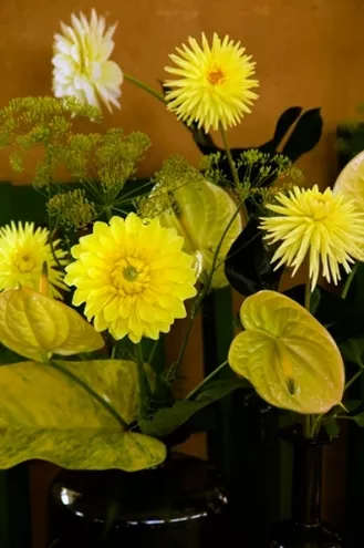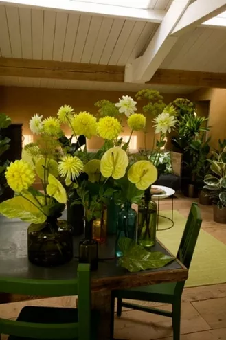 Tak jak botanik, możemy stworzyć w swoim wnętrzu małe laboratorium z różnymi gatunkami kwiatów. Zielone naczynia i butelki tworzą harmonię z kwiatami w kolorze limonki: anturium, dalią i koprem. Aranżacja jest bardzo świeża i energetyczna.Anturium, Dalia, Koper, liście