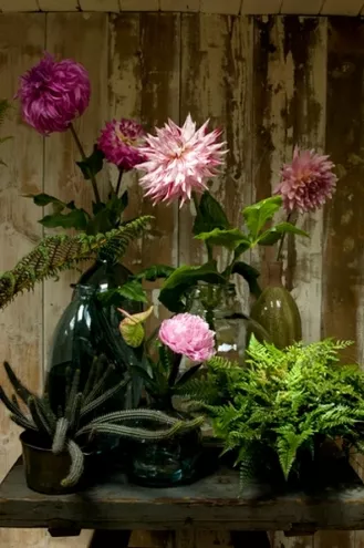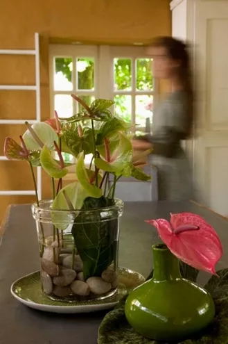 Białe i zielone naczynia doskonale podkreślają charakter różowej dalii. Połączenie zieleni z różem wyzwala świeżość i energię.Anturium, Dalia
