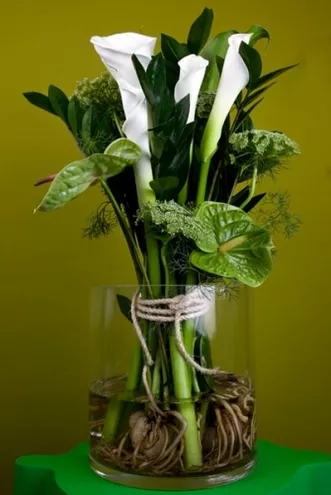 Szklane naczynie odsłania niezwykły kształt korzeni, które odkrywają przed nami siły drzemiące w przyrodzie. Kwiaty i liście wyglądają tak, jakby dopiero zostały ścięte w tropikalnej dżungli. Taka aranżacja wyzwala w nas wiele energii i siły.Anturium, Cantedeskia, Koper