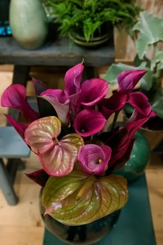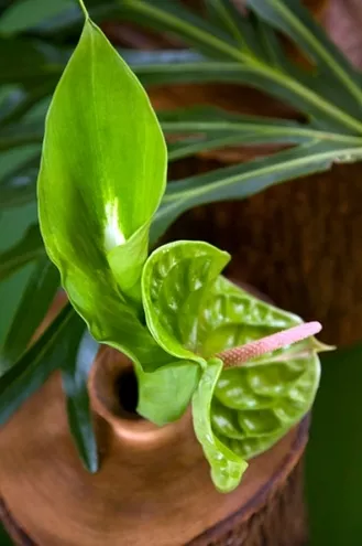 Drewniany wazon, ciepła zieleń anturium i cantedeskii przeniesie nas w głąb puszczy amazońskiej. Ta prosta aranżacja silnie oddziałuje na nasze zmysły, wyzwalając w nas spokój. Anturium, Cantedeskia