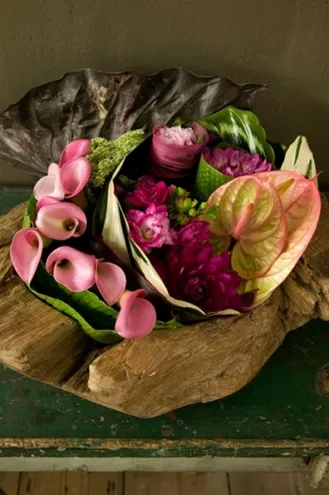 Kwiaty o intensywnych barwach różu i zieleni tworzą niesamowity kontrast z jasną fakturą drewna. Ta romantyczna, elegancka aranżacja sprawi, że daleko odpłyniemy myślami.Cantedeskia, Frezja, Anturium, Koper, Dalia.