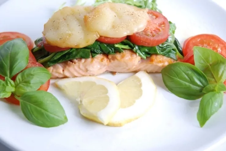 Łosoś z rusztu z pomidorami, szpinakiem i wędzonym serem