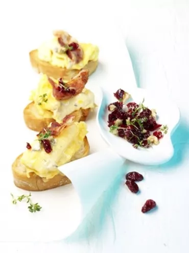 Grzanki z omletem z serem gorgonzola i sosem z cranberries