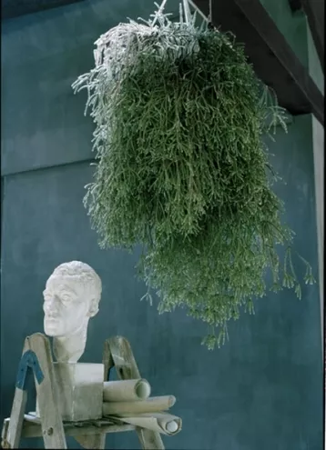 Rhipsalis cassutha - Wisząca piękność.Ten sukulent z rodziny kaktusów, chociaż ma bardzo nowoczesny wygląd, mógłby pochodzić z czasów dinozaurów. Jego ozdobne długie pędy z wieloma rozgałęzieniami zamiast cierni mają krzaczaste włoski. Zimą pojawiają się na nim małe białe kwiatki, które na wiosnę zostają zastąpione przez białe jagody. Można podlewać go raz na miesiąc i w razie potrzeby przycinać w celach pielęgnacyjnych.