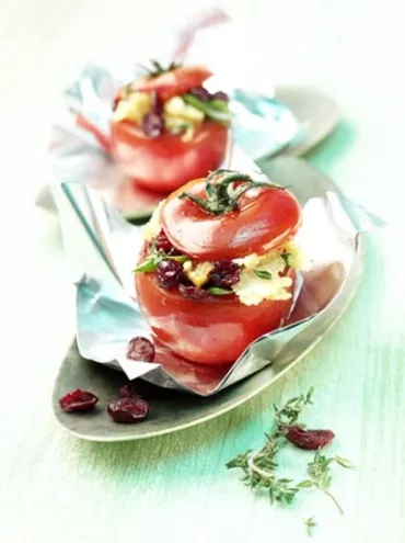 Pomidory umyć, obciąć górną część. Wydrążyć usuwając miąższ. Wnętrze pomidorów osuszyć ręcznikiem papierowym i posypać pieprzem. Ser kozi obrać i pokruszyć. Orzechy posiekać, uprażyć przez chwilę na małej patelni. Dymki oczyścić, umyć i drobno pokroić. Cranberries grubo pokroić. Przygotowane składniki połączyć z cranberries, tymiankiem i oliwą z oliwek. Mieszanką napełnić pomidory, przykryć odciętymi częściami. Każdy pomidor zawinąć w kawałek folii aluminiowej odpowiedniej wielkości. Zapiekać na grillu na węgiel drzewny przez ok. 5 minut.