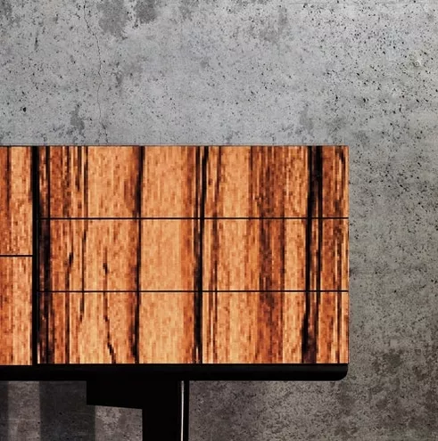 Przedstawienie obrazu w postaci pixeli daje wyjątkowy efekt – grafika zmienia się w zależności od dystansu z jakiego jest oglądana. Z bliska wyraźnie widać pojedyncze elementy zdigitalizowanego obrazu, wraz ze zwiększaniem odległości obraz staje się ostrzejszy i coraz bardziej przypomina naturalny fornir. Od ”natualnego” drewna szybko przechodzimy do grafiki typowej dla gier komputerowych czy wiekoformatowych reklam.