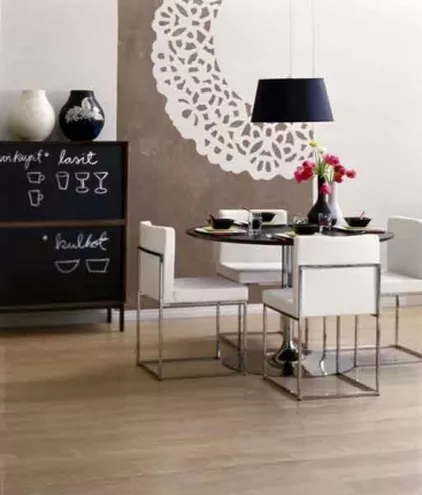 Na zdjęciu powyżej jadalnia niezwykle zdyscyplinowana kolorystycznie, proste formy mebli i naczyń. Rysunki i napisy kredą na drzwiczkach szafki, to może być praktyczny pomysł Jego. Wzór na ścianie z motywem koronkowej serwetki na pewno wymyśliła Ona.
