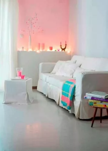 Fragment pokoju dziennego. Wątek kobiecy to zmiękczenie mebli pokrowcami, kolekcjaozdób ograniczona do jednej półki i dodatkipastelowych kolorów. Ten róż może sięJemu nie spodobać.