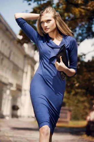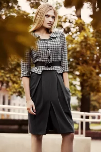 Oprócz całej gamy eleganckich żakietów i spódnic w kolekcji jest doskonały wybór dopasowanych do ciała sukienek do kolan z miękkiej dzianiny utrzymanych w stylu „casual” i w prosto zdefiniowanej kolorystyce czerwieni i przełamanego szarością granatu, które nabierają bardziej zdecydowanego charakteru, kiedy są spięte w pasie ciemnym paskiem. Na pierwsze dni słonecznej jesieni marka proponuje jedwabne sukienki w dyskretnych odcieniach ujętych w kwiatowe motywy z mocniejszymi akcentami w odcieniu śliwki, czy czerni. Ostatnie w tym roku promienie słońca pozwolą kobietom eksponować ramiona w sukienkach na ciekawie skomponowanych szerokich ramiączkach. Codzienna stonowana elegancja wieczorami ustępuje delikatnym stylizacjom retro: uroczym, odcinanym pod biustem sukienkom z grafitowej koronki, z dyskretnym żabotem i rękawami obcisłymi tylko na przedramionach. Warto mieć w szafie również tunikę w nieregularnie geometryczny wzór z paskiem z dzianiny, który można niedbale zawiązać na biodrach.