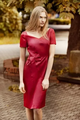Na większe okazje GaPa Fashion proponuje wysmakowaną prostotę: długą do kostek kreację w odcieniu butelkowej zieleni lub satynową sukienkę w kolorze malinowej czerwieni z subtelną kokardą na wysokości biodra oraz klasycznym dekoltem karo i krótkim rękawkiem.