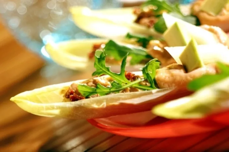 Cykorie myjemy i usuwamy części nie jadalne, rukolę myjemy i suszymy. Cienką warstwę Pasteli z suszonych pomidorów układamy na cykorii na wierzch układamy sałatę rukola następnie układamy warstwę pastelli z pstrąga i dekorujemy awokado i melonem.