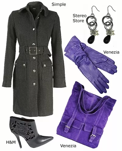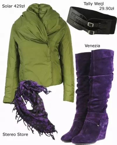 W naszych zestawach koniecznie musi pojawić się akcent kolorystyczny. Jeśli nie w postaci „dania głównego”, czyli okrycia lub butów, to chociaż niech będzie to „deserowy” dodatek. Każda z nas powinna posiadać w swojej szafie modne kontrasty: niebiesko- brązowy lub czerń z fioletem. Unikamy butów i torebek w jednakowym kolorze- lepiej połączyć je z jakimś drobnym dodatkiem, np.: fioletowe buty i chusta, kremowa torebka i szal. Wszystko z miękkich i przyjemnych skór, zamszu i innych materiałów.