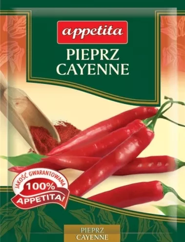 Pieprz Cayenne marki Appetita pochodzi ze słonecznej Hiszpanii. Walory tej ostrej przyprawy już dawno doceniły osoby stosujące dietę. Odrobina pieprzu kajeńskiego dodana do potrawy rozrusza metabolizm, przyspieszy przemianę materii. Produkt posiada także właściwości przeciwbólowe dzięki zawartej w nim kapsaicynie. Pieprz turecki dzięki odpowiednim związkom chemicznym pomaga przedłużać trwałość produktów spożywczych. Lecznicze atrybuty pieprzu Cayenne wykorzystywane są w medycynie naturalnej. Najczęściej leczy się nim choroby układu krążenia, bóle reumatyczne oraz bóle brzucha. Podczas infekcji szczyptę przyprawy rozrobionej z wodą możemy używać do płukania gardła. Pieprz Cayenne skutecznie rozgrzeje ciało w chłodne jesienne wieczory. Pozwoli również skutecznie oczyścić organizm z toksyn. W kuchni przyprawa Appetita znakomicie sprawdzi się podczas przygotowywania sosów, mięs oraz dań warzywnych.