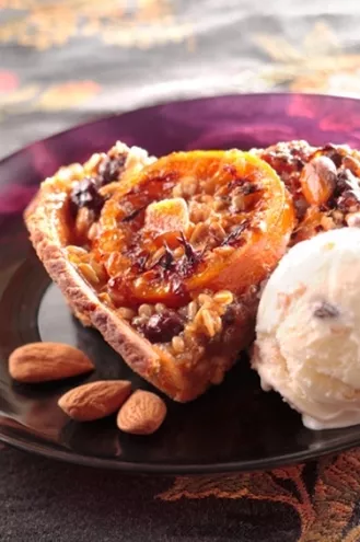 Która z Was nie miałaby ochoty na przepyszną tartę na gorąco z imbirem i pomarańczą w towarzystwie rozpływającej się gałki lodów bakaliowych?